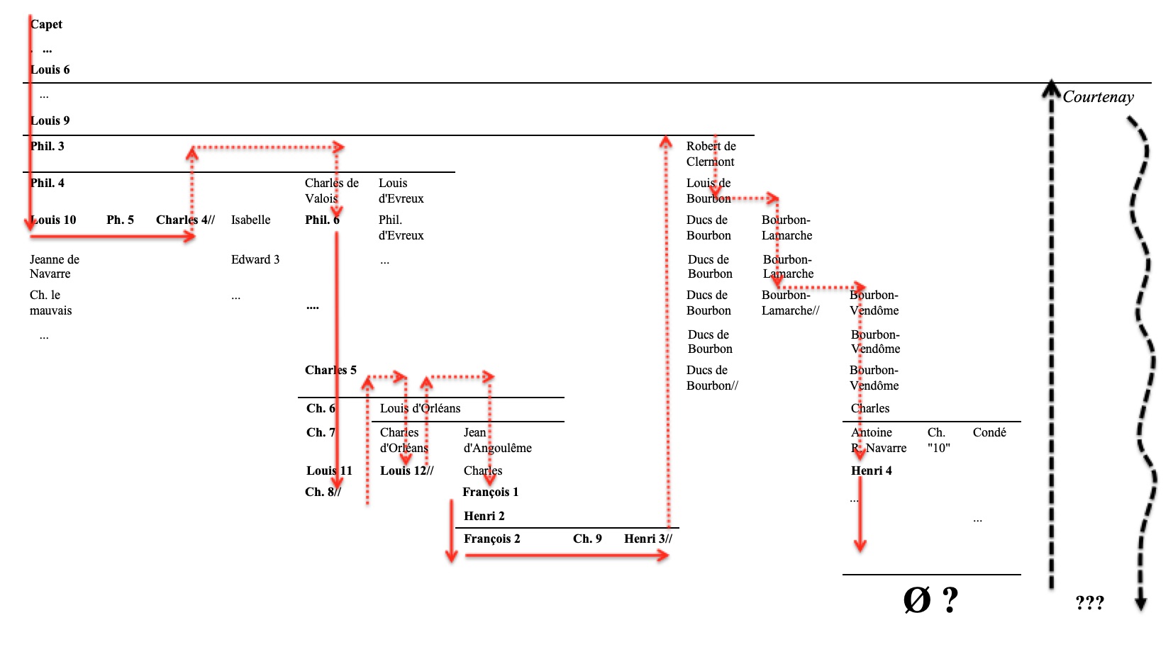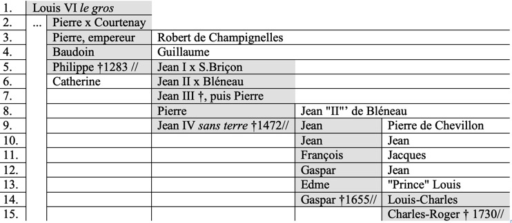 problme qui nous occupe dŽpasse la gŽnŽalogie (cf. Annexe 2), ne discutons pas le schŽma qui justifie les Courtenay tardifs : Louis VI, Pierre (branche impŽriale), puis Champignelles, puis BlŽneau. Le premier fils de l'oncle BlŽneau poursuit cette sous-branche, le second engendre une branchette Chevillon qui survivra ˆ la prŽcŽdente et se fera prince (sans consŽquence).
