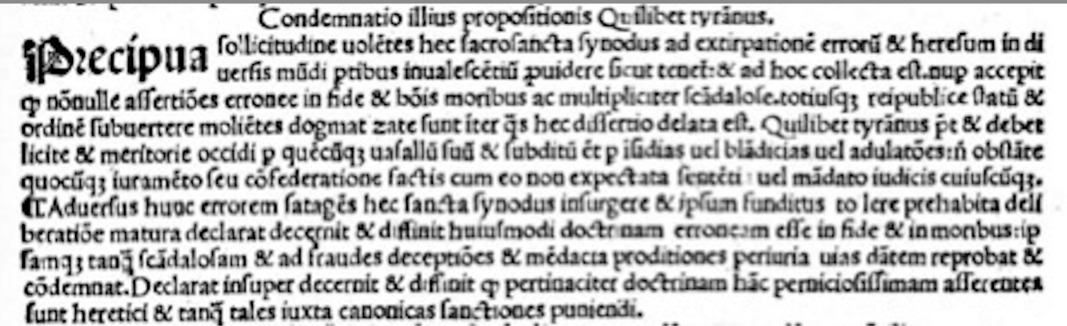 Alors que la première vérité de Petit [40] autorise clairement l'occision de tout sujet ou vassal qui machine contre le salut corporel de son Roi & Souverain Seigneur, l'ambigu décret de Constance peut se lire de deux façons. Si on lui prête la définition du tyran de Petit (qui in re publica non jure principatur aut principari conatur), en interdisant l'occision du criminel, il favorise le régicide [41]. Si on le prend littéralement, il ne contient qu'une généralité : face à un "tyran", on ne doit pas se faire justice soi-même, encore moins par des moyens déloyaux, mais obtenir régulièrement une sentence ou un mandat d’un juge quelconque. La belle affaire !